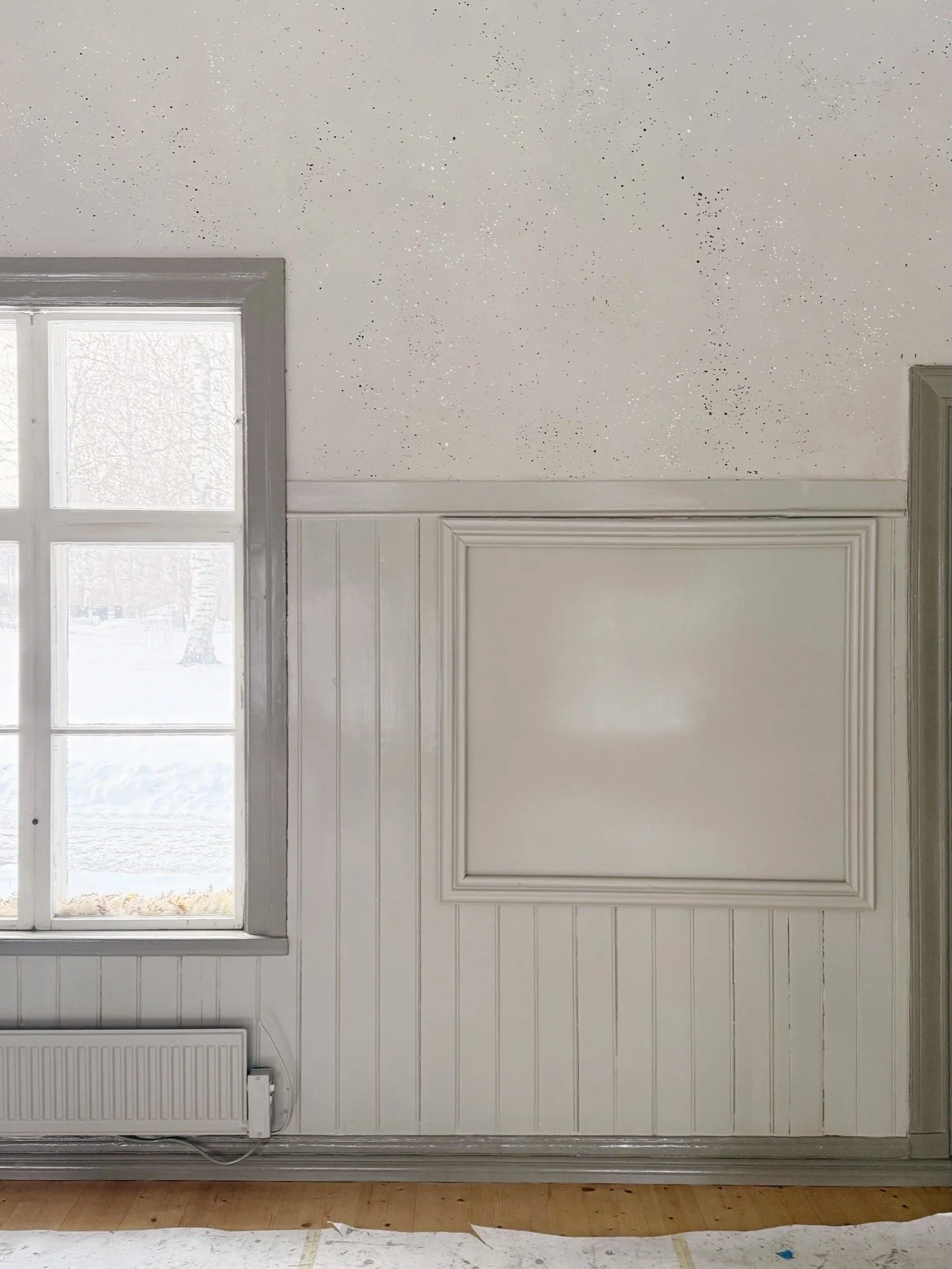 Panelen och omfattningar har fått ny nyans med linoljefärg, väggarna har pappspänts och målats med äggoljetempera och därefter stänkmålats. Taket har lagats och målats med äggoljetempera och murstockarna har lagats och målats.